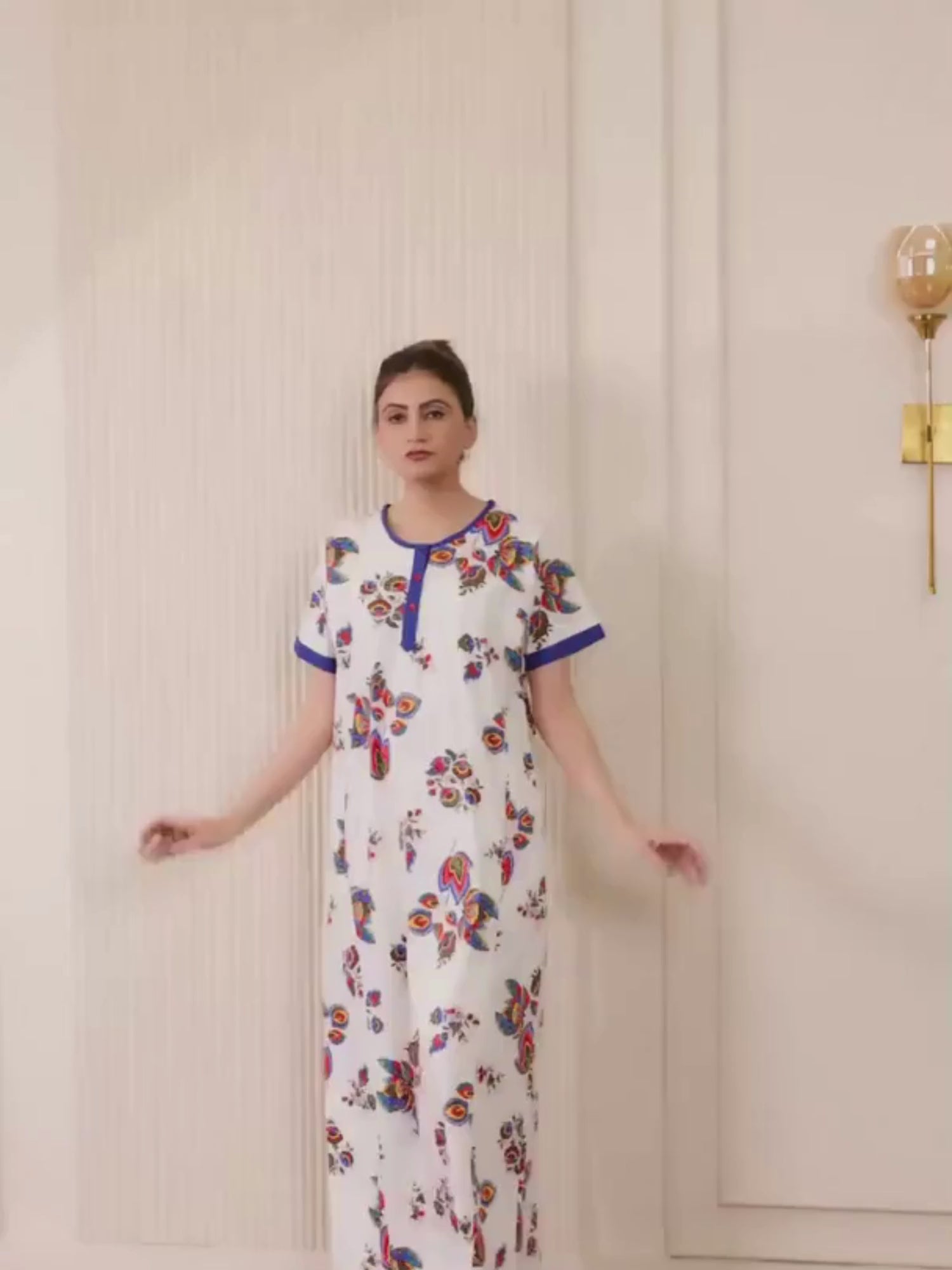Settle into softness with this cotton nightdress scattered with vibrant florals, finished with royal-blue trims and a neat button placket. Light, breathable, and easy to live in—from lights-out to lounge-about.