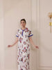 - Color/Print: Cream base with multicolor floral motifs; royal-blue trims