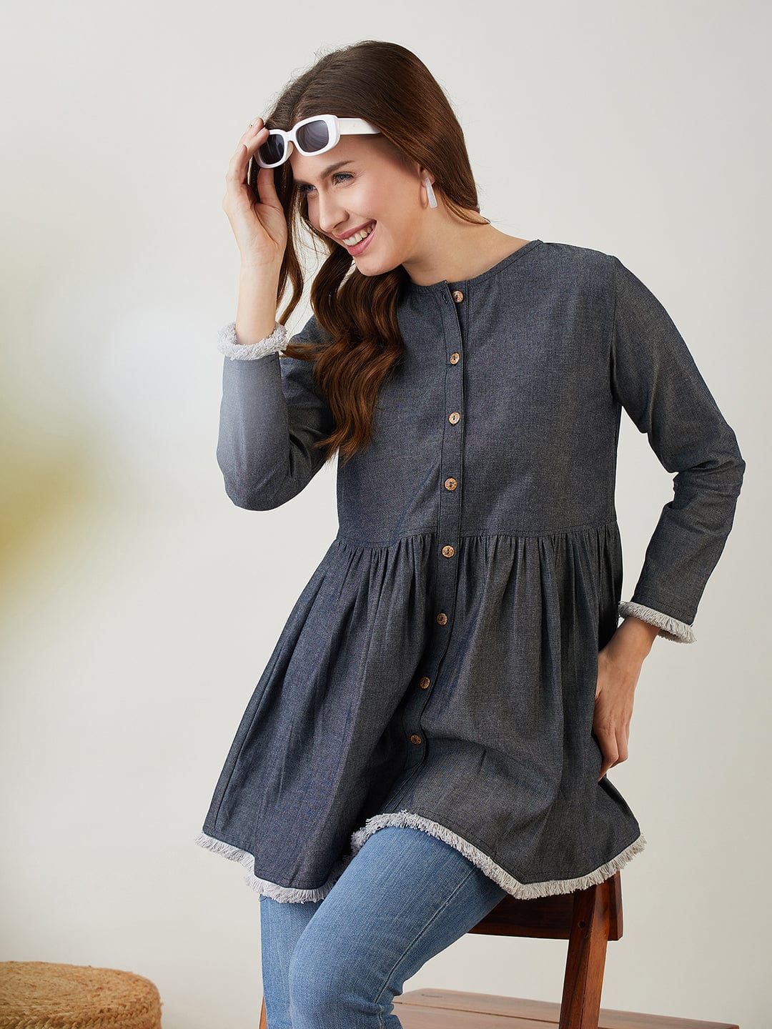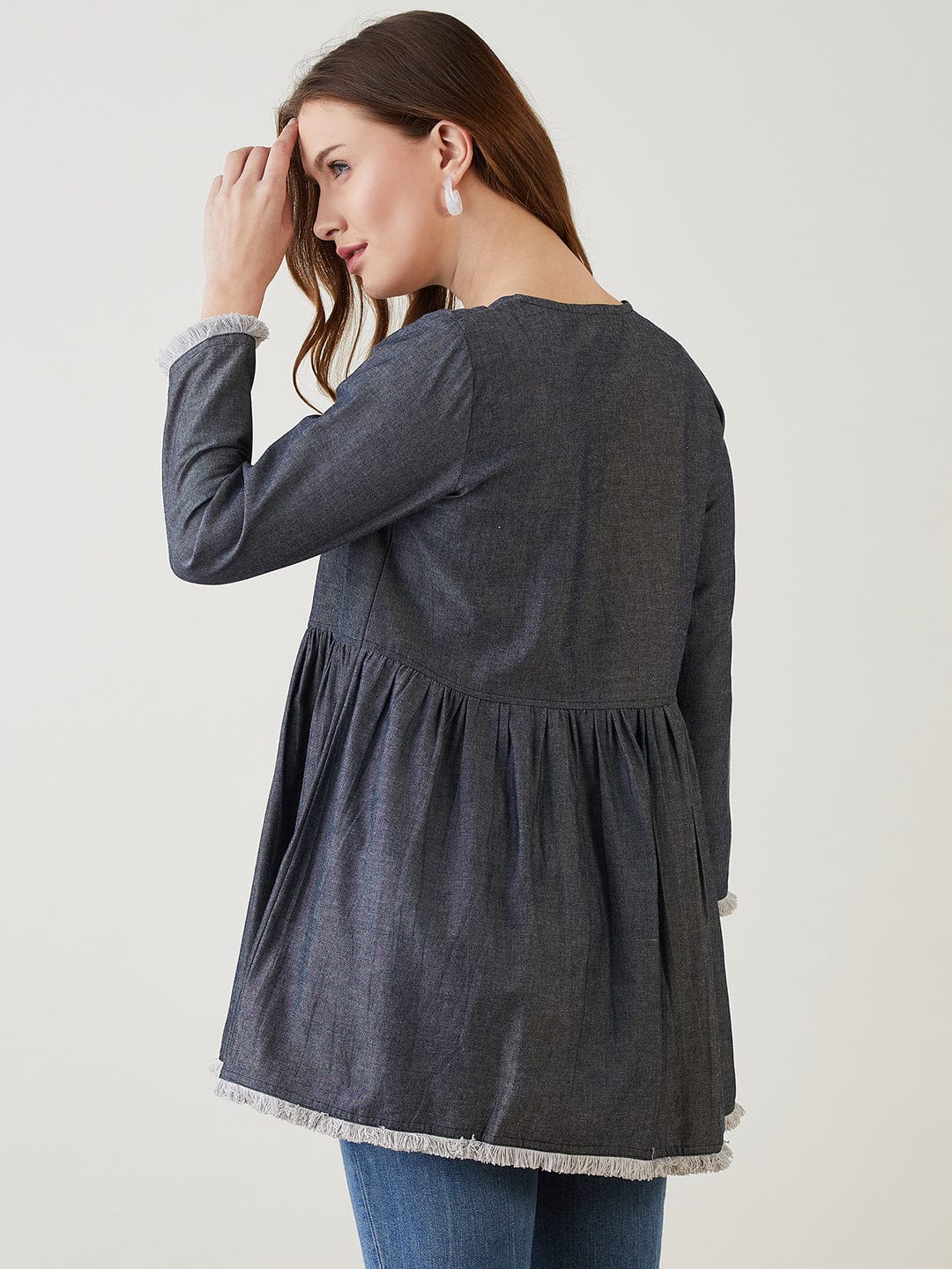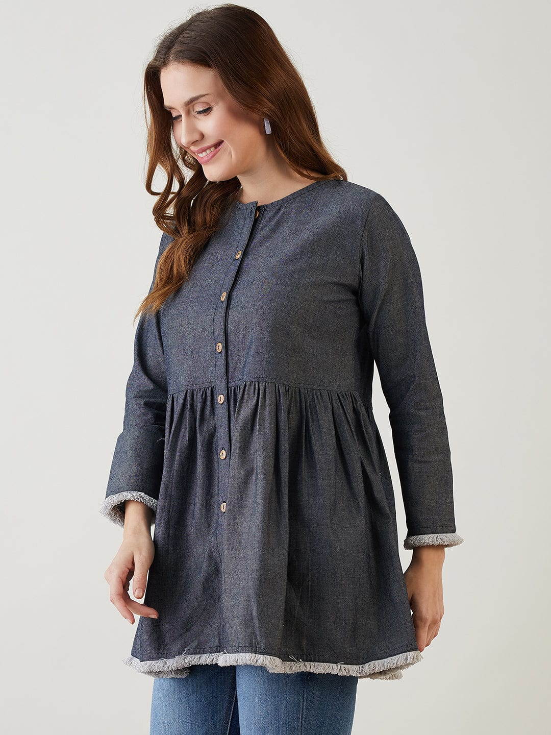 Elevate your casual style with this blue cotton denim top, designed for everyday ease and understated charm. The round neckline, front button closure, and softly gathered waistline create a feminine silhouette, while the fringe detailing at the hem and sleeves adds a touch of playful sophistication. Crafted from lightweight breathable cotton denim, this top offers unmatched comfort and versatility for every season.