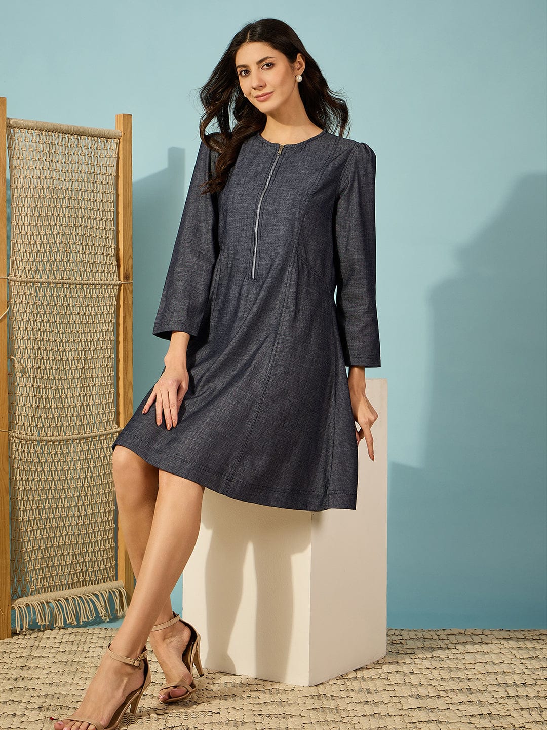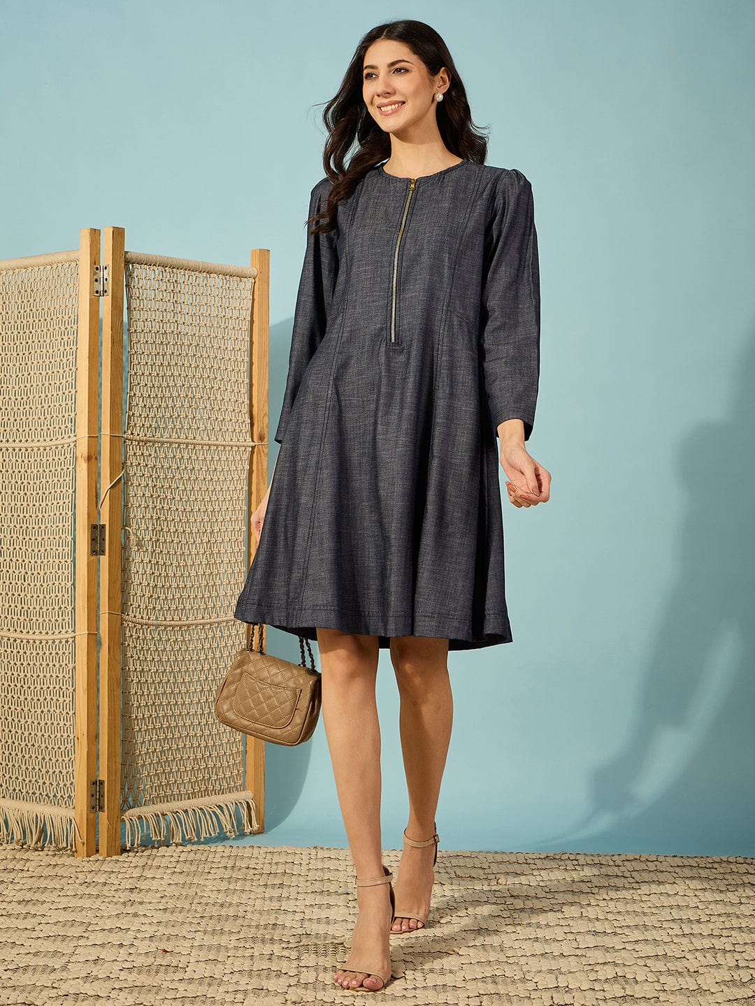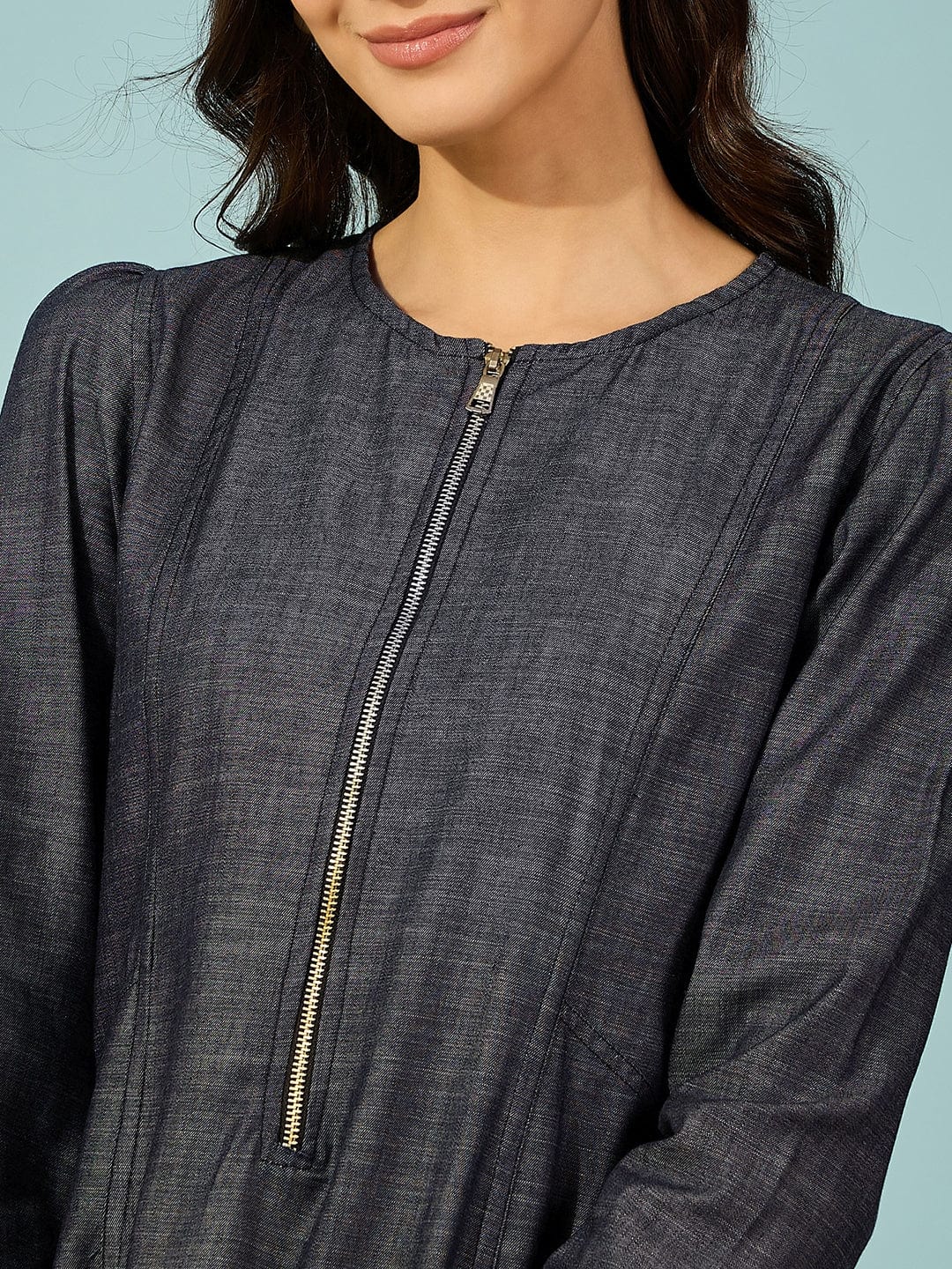 Effortless and chic, this grey cotton denim dress blends modern minimalism with everyday comfort. Featuring a round neckline, front zip closure, and long sleeves, it creates a clean, structured silhouette that moves gracefully. The soft cotton denim fabric ensures breathable ease, making it the perfect choice for stylish daywear or casual evenings out.