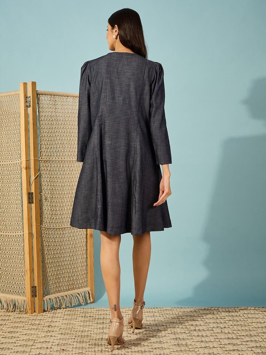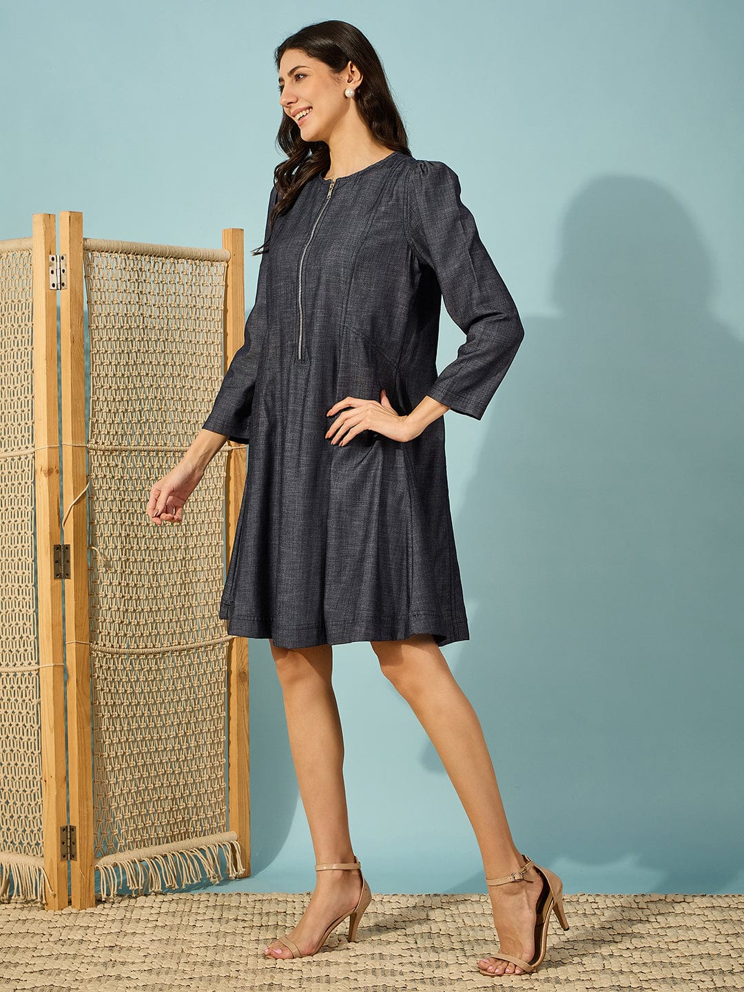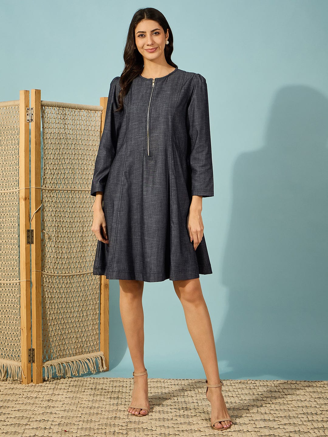 Effortless and chic, this grey cotton denim dress blends modern minimalism with everyday comfort. Featuring a round neckline, front zip closure, and long sleeves, it creates a clean, structured silhouette that moves gracefully. The soft cotton denim fabric ensures breathable ease, making it the perfect choice for stylish daywear or casual evenings out.