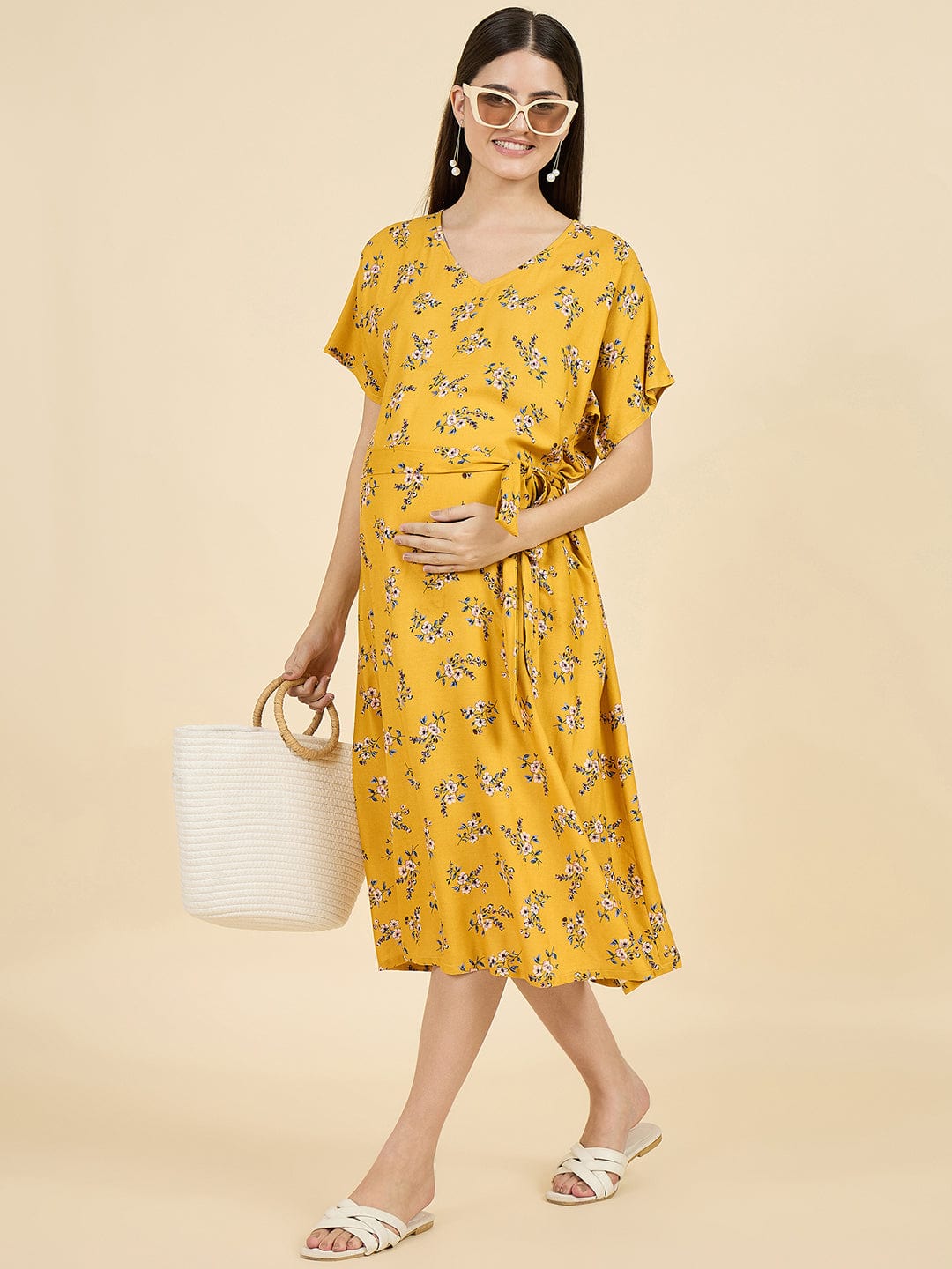 Mustard Floral Viscose Rayon Maternity Dress with Tie Belt