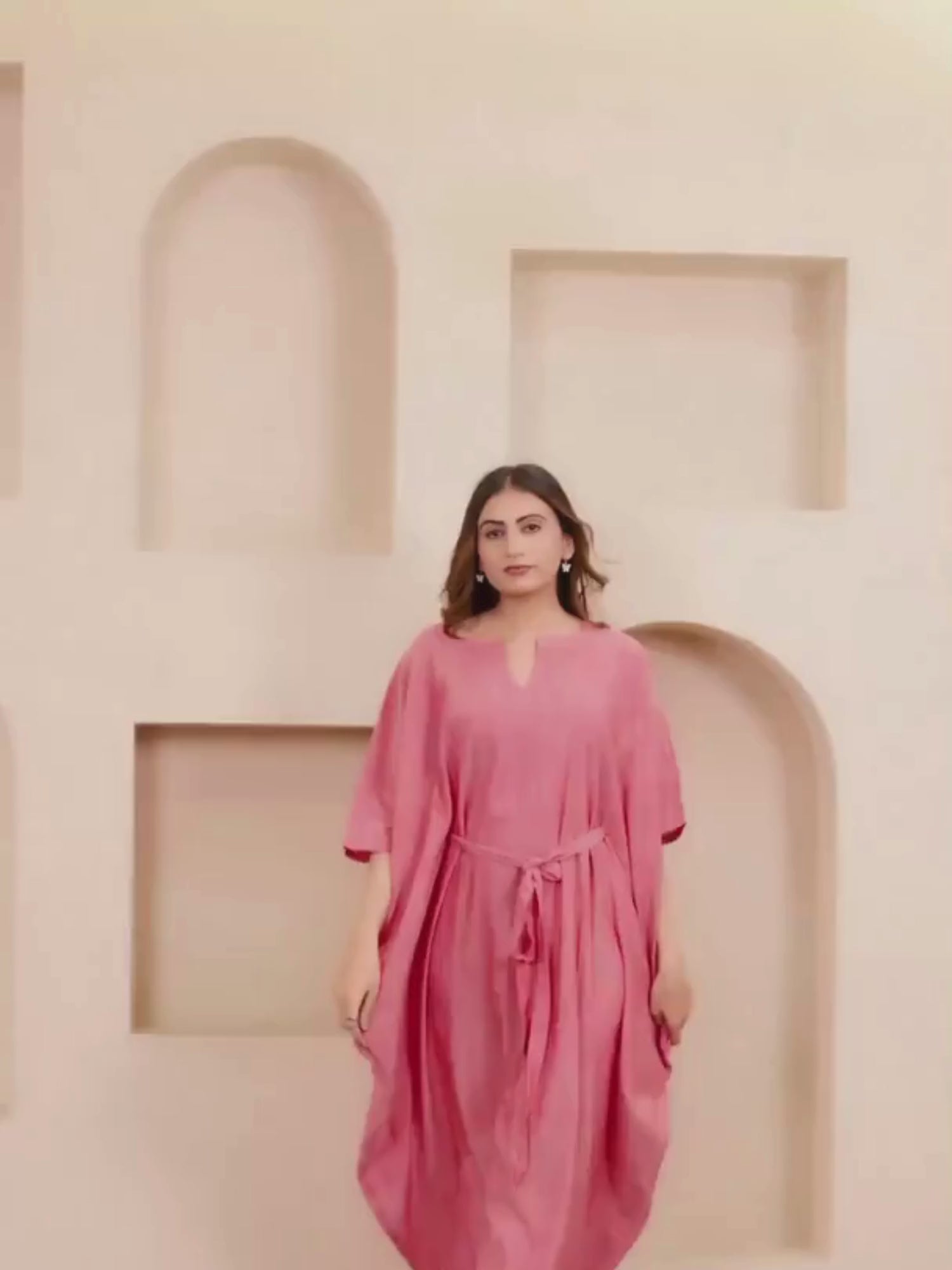 Transform your lounging experience with this serene rose-pink kaftan that balances effortless comfort and polished style. The fluid drape, self-tie belt, and airy silhouette make every at-home moment feel luxurious.